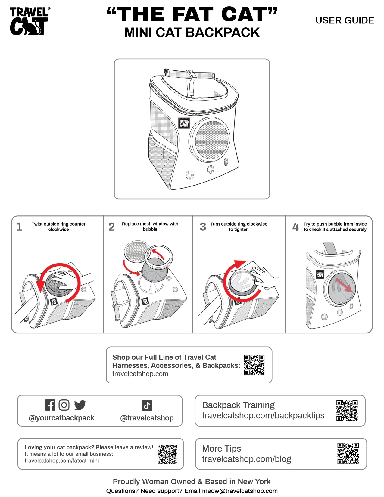 This mini cat bubble backpack is the little sibling of our catstomer-favorite, "The Fat Cat" Backpack Carrier. Designed for smaller felines, it has all of the best features of "The Fat Cat", just miniature sized! It makes the coziest & safest space for your little furriend to call home while out & about with you. Just imagine them peering out the bubble window at the world around them, taking in all the sights & sounds! This sturdy & breathable cat backpack will follow you on all of life's adventures, big & small - whether that looks like a trip to the vet, walk around the block, journey in the car, or hiking trip.